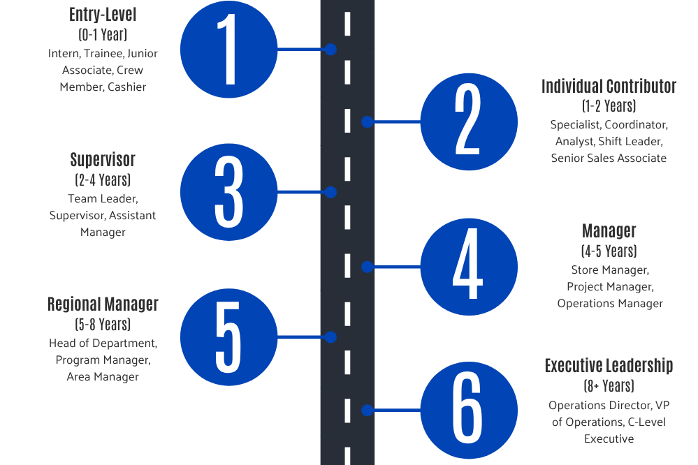 Take a look at our Career Advancement Road Map. It will help you understand where you are in your job right now based on your current or past job title and how long you've worked. It also shows you the different paths you can take to move forward in your career.